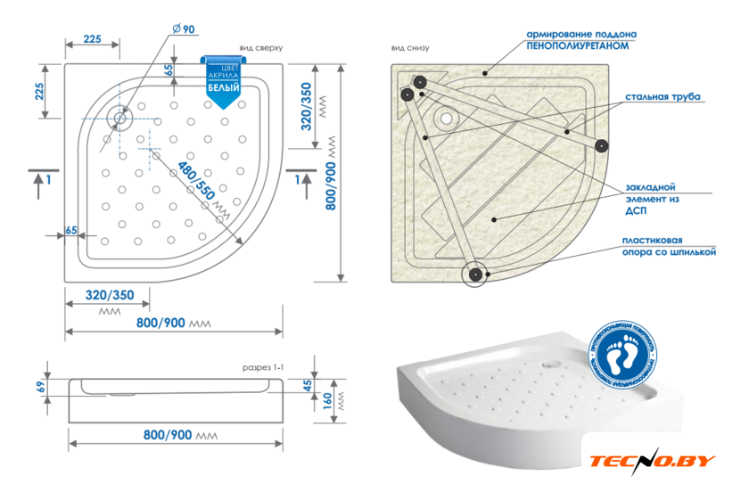 квадратный, 90x90 см, акрил, низкий, 17 см, цвет: белый