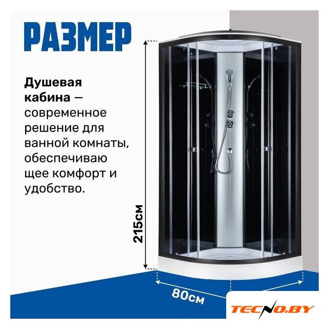 Душевая кабина Saniteco SN-180B 80x80 станет идеальным выбором для небольших ванных комнат, сочетая в себе компактные размеры и современные функциональные решения. Высота кабины составляет 215 см, ширина и глубина — по 80 см, что позволяет установить ее даже в ограниченном пространстве. Закругленный низкий поддон придает эстетичный вид и обеспечивает комфортное использование.