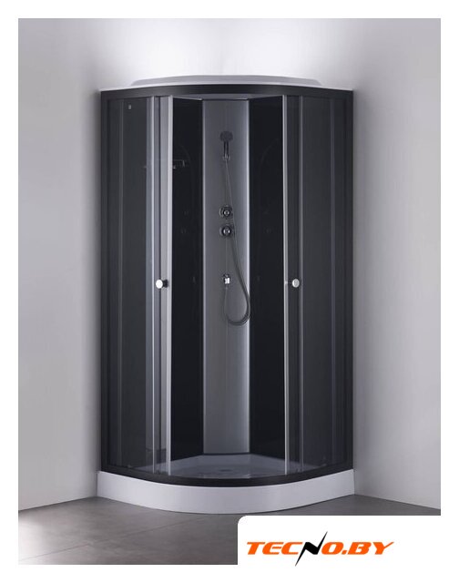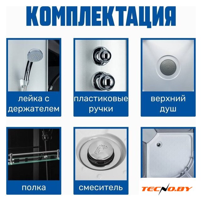 В стандартную комплектацию кабины входит смеситель и верхний тропический душ, обеспечивающий приятный расслабляющий эффект. Для дополнительного удобства доступен ручной душ (душевая лейка) и полки для размещения принадлежностей. Комплектация также включает в себя сифон и поддон, что упрощает процесс установки и эксплуатации.