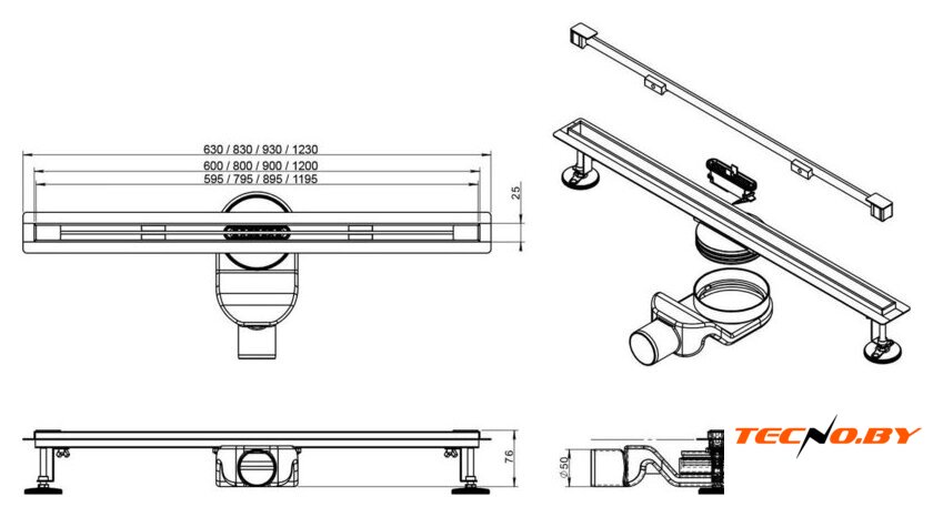 для душа, сталь, слив 50 мм, длина 600 мм, комбинированный, сливная решетка
