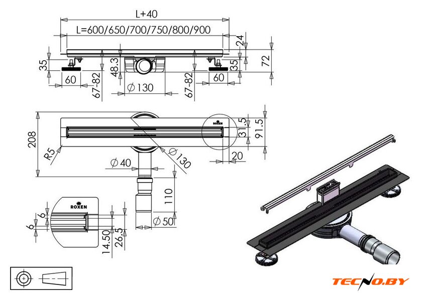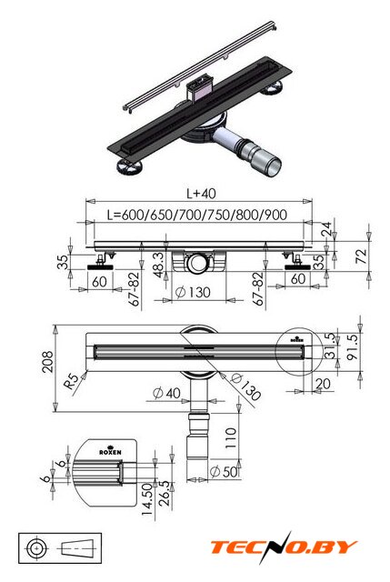 для душа, сталь, труба 40 мм, длина 800 мм, комбинированный, цвет крышки: серый
