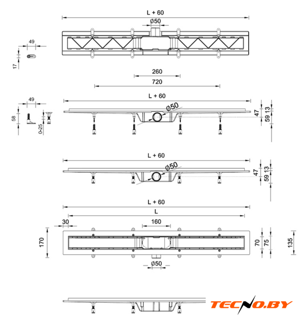 для душа, полипропилен, труба 50 мм, комбинированный, сливная решетка, цвет крышки: белый