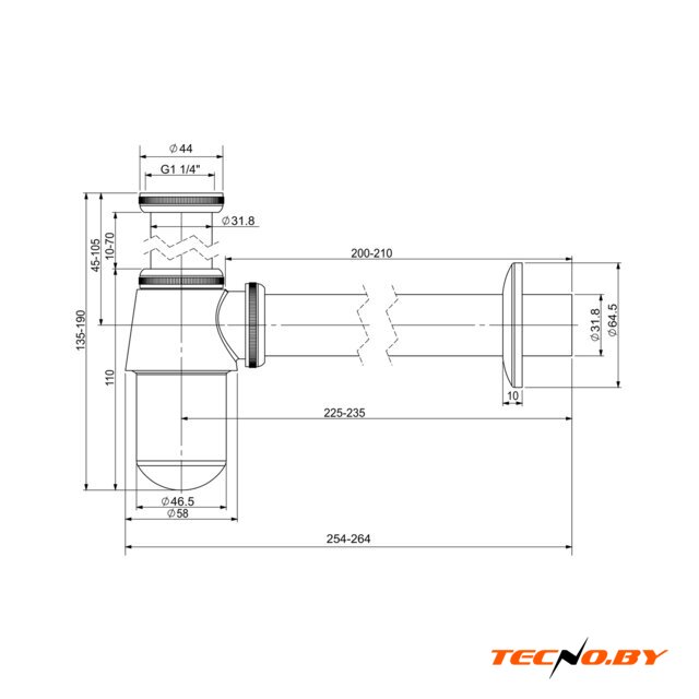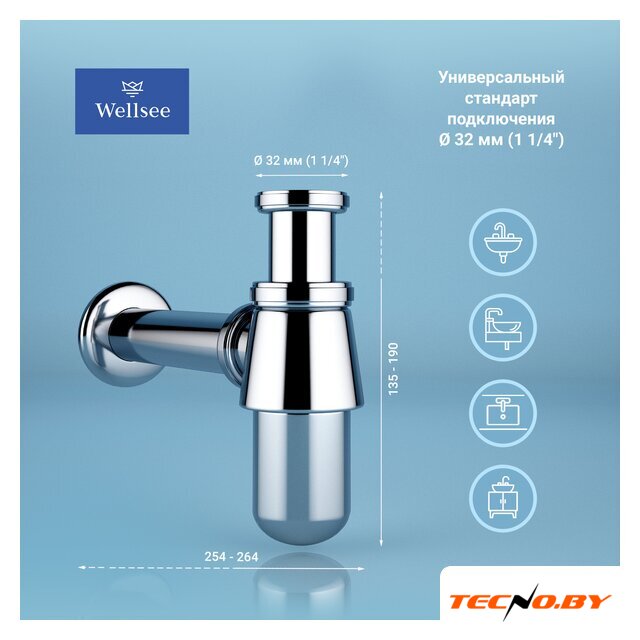 для умывальника, трубный, латунь, резьба 1 1/4", слив 32 мм, труба 32 мм, длина 270 мм, гидрозатвор, сливная решетка, цвет крышки: хром