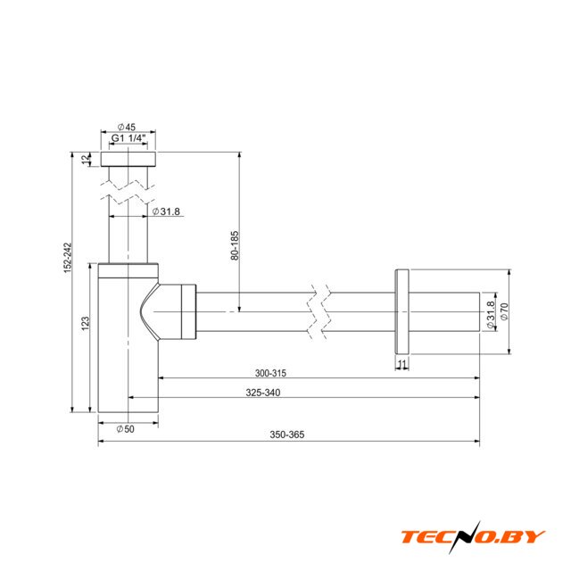 для умывальника, бутылочный, латунь, резьба 1 1/4", труба 32 мм, длина 328 мм, гидрозатвор