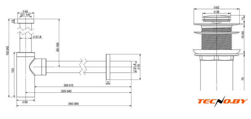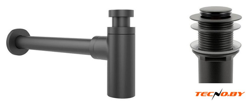 для умывальника, бутылочный, латунь, резьба 1 1/4", труба 32 мм, длина 328 мм, гидрозатвор, цвет крышки: черный