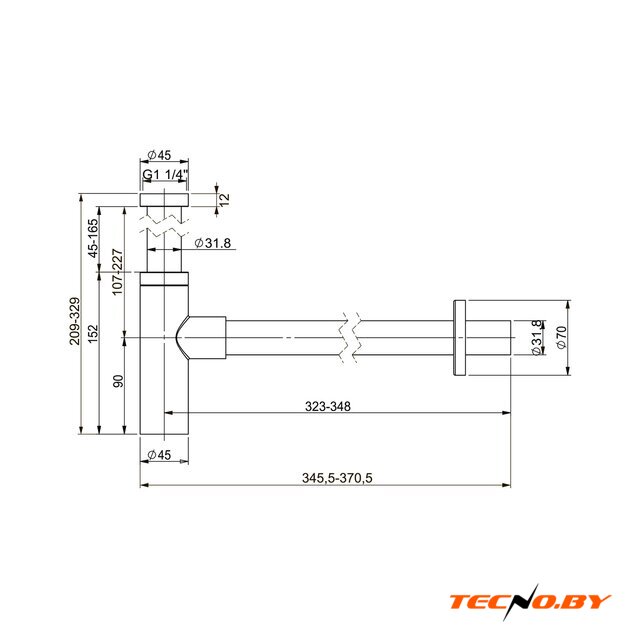 для умывальника, бутылочный, латунь, резьба 1 1/4", труба 32 мм, длина 350 мм, гидрозатвор
