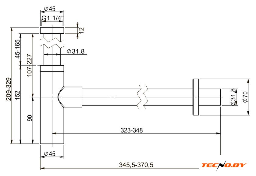 для умывальника, бутылочный, латунь, резьба 1 1/4", труба 32 мм, длина 328 мм, гидрозатвор