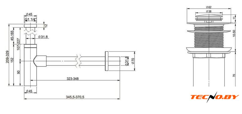 для умывальника, бутылочный, латунь, резьба 1 1/4", труба 32 мм, длина 328 мм, гидрозатвор, цвет крышки: черный