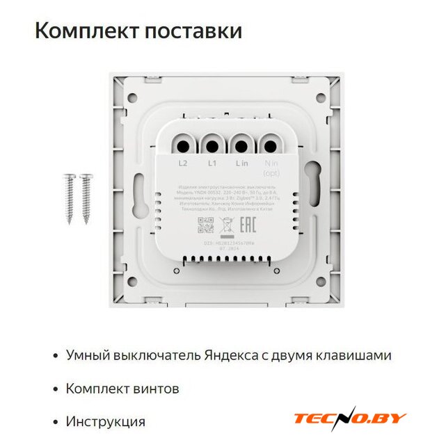 Комплектация | Умный выключатель Яндекса с двумя клавишамиКомплект винтовИнструкцияДокументы |