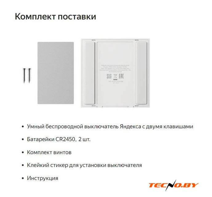 Комплектация | Умный беспроводной выключатель Яндекса с двумя клавишамиБатарейки CR2450, 2 шт.Комплект винтовКлейкий стикер для установки выключателяИнструкция |