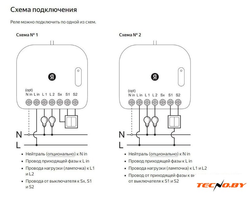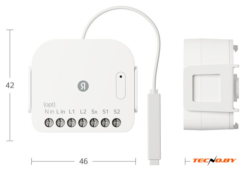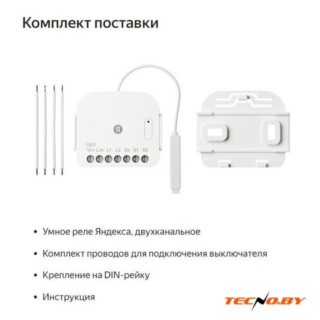 Комплектация | Умное реле Яндекса, двухканальноеКомплект проводов для подключения выключателяКрепление на DIN‑рейкуИнструкцияДокумент |
