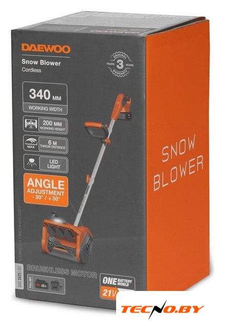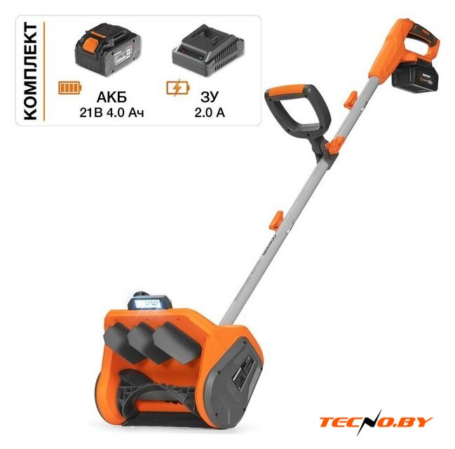 | Комплектация | - Снегоуборщик- Аккумуляторная батарея 1 шт- Зарядное устройство 1 шт- Инструкция по эксплуатации- Гарантийный талон |