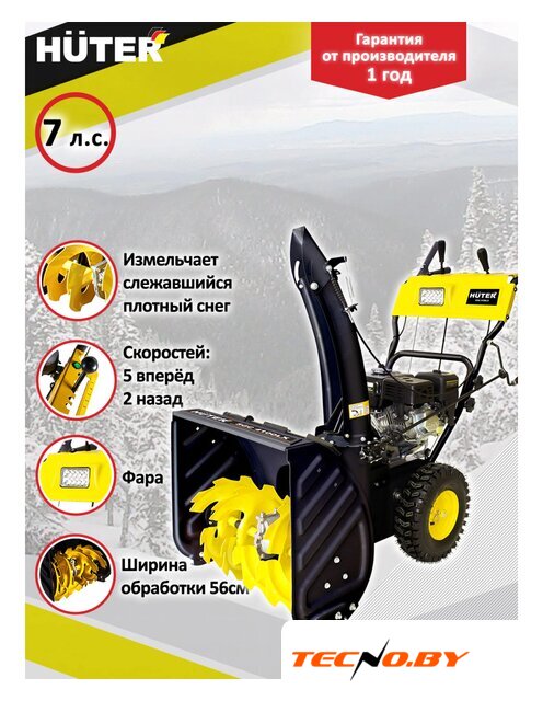 самоходный, бензиновый двигатель 7 л.с., захват 56x50 см, выброс на 10 м