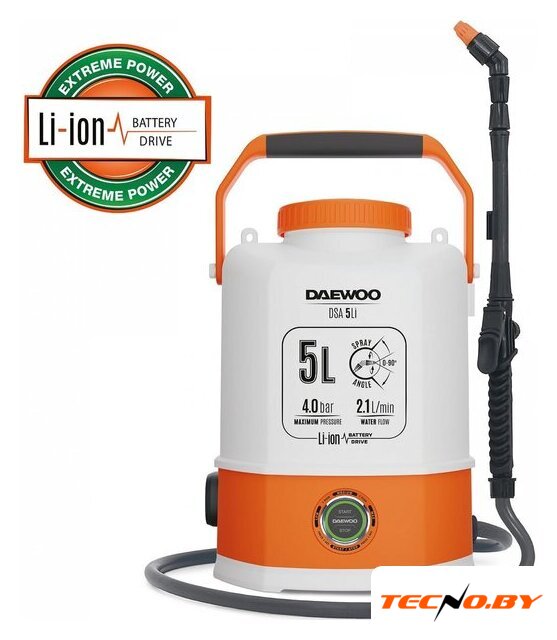 Основой питания этого опрыскивателя служит современный литий-ионный аккумулятор с напряжением 16 В и емкостью 3 А·ч. Такое решение обеспечивает долговременную работу устройства без необходимости частой подзарядки. Вместе с опрыскивателем поставляется зарядное устройство DAEWOO DACH 1516Li, что делает процесс зарядки быстрым и простым.