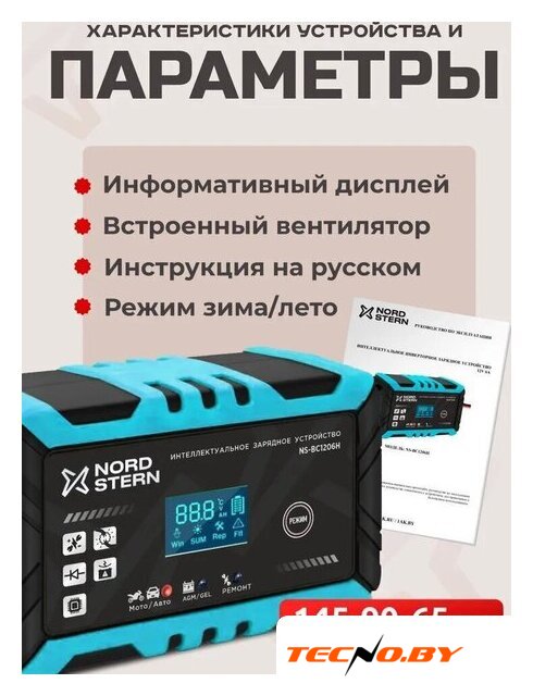 ёмкость заряжаемой батареи: 4–100 А·ч, ток зарядки: 6 А, масса: 0.42 кг