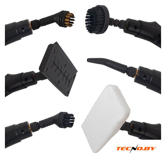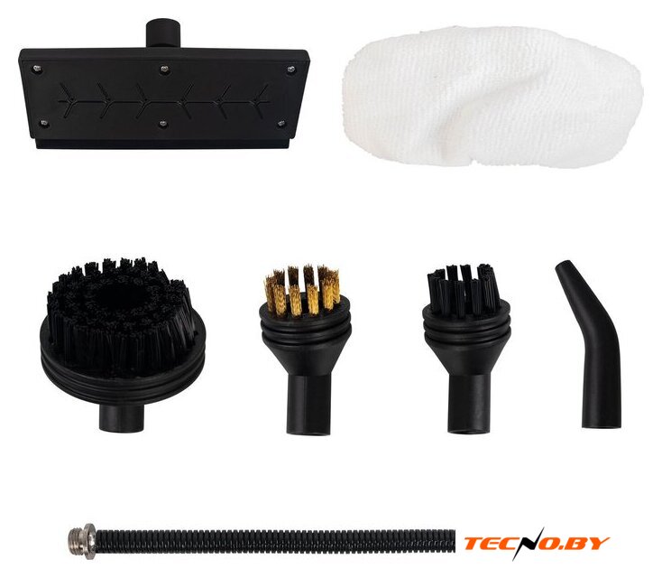 | Дополнительные насадки и приспособления | угловая насадка-распылитель для труднодоступных мест; малая круглая щетка с полимерной щетиной; большая круглая щетка с полимерной щетиной; малая круглая щетка с металлической щетиной; плоская насадка-скребок с равномерным распылением; тканевый чехол на плоскую насадку |