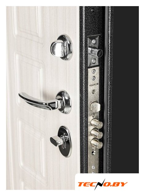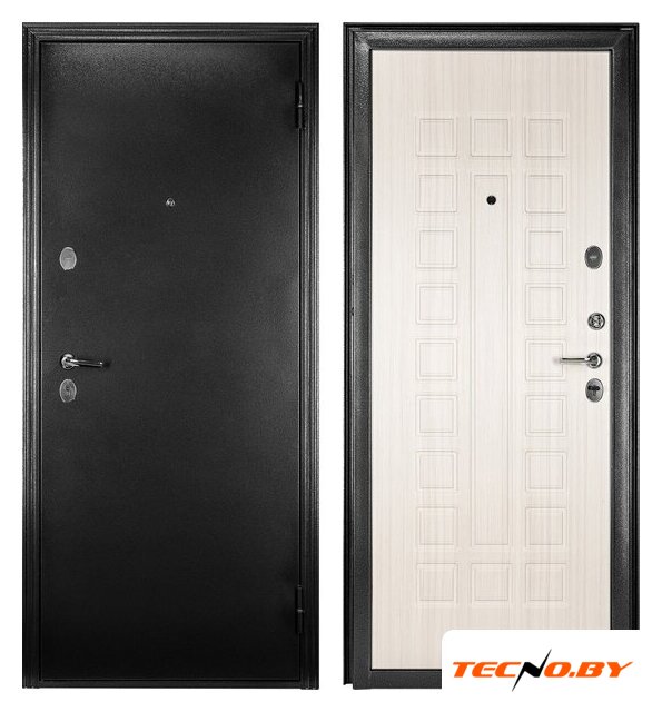 металл: 1 мм, открытые петли 2 шт., два замка (цилиндровый + сувальдный), отделка: металл (снаружи), ХДФ (внутри)
