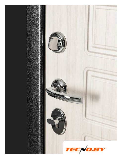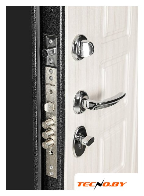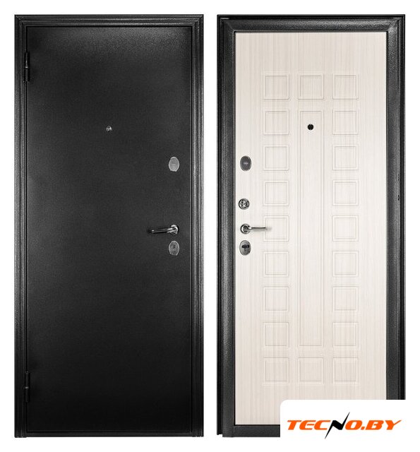 металл: 1 мм, открытые петли 2 шт., два замка (цилиндровый + сувальдный), отделка: металл (снаружи), ХДФ (внутри)