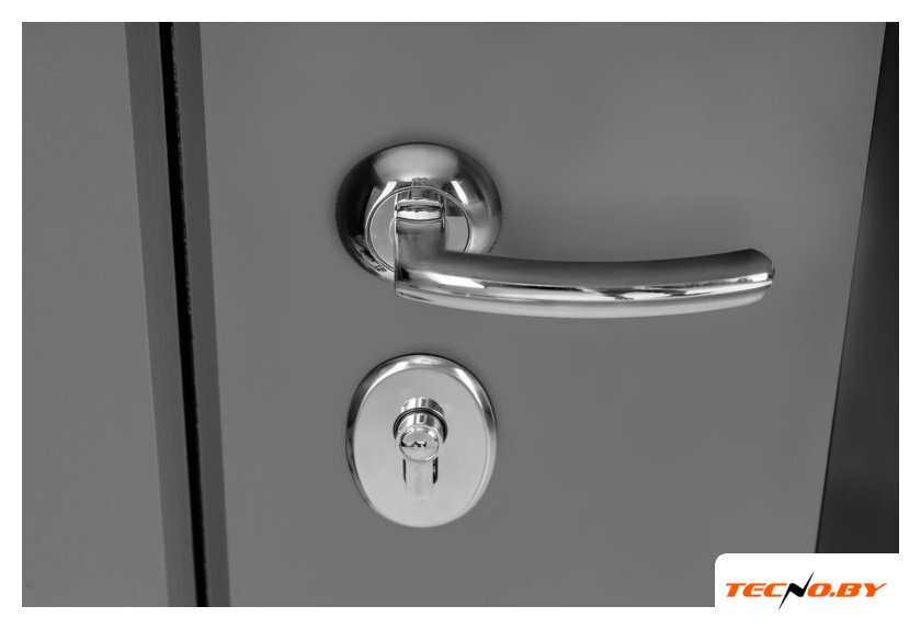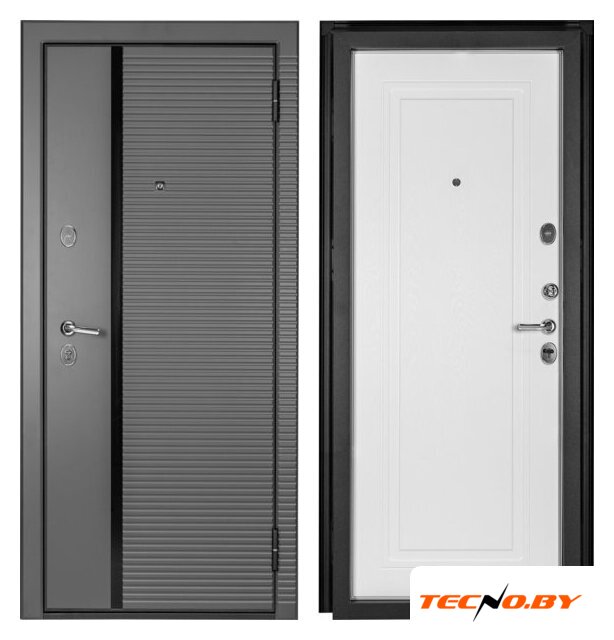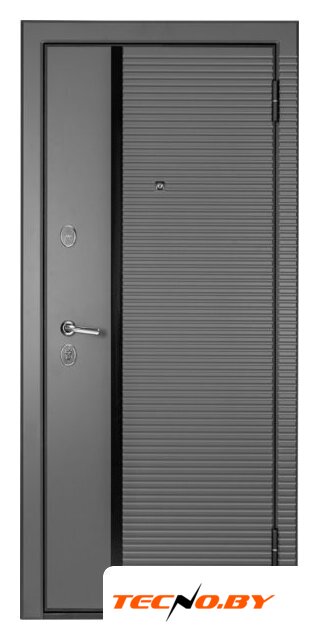 металл: 1 мм, открытые петли 2 шт., два замка (цилиндровый + сувальдный), отделка: металл (снаружи), МДФ шпонированный (внутри)