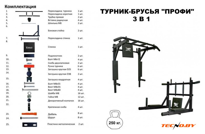 турник с брусьями, для занятий дома, установка на стену, максимальный вес пользователя: 150 кг, сталь