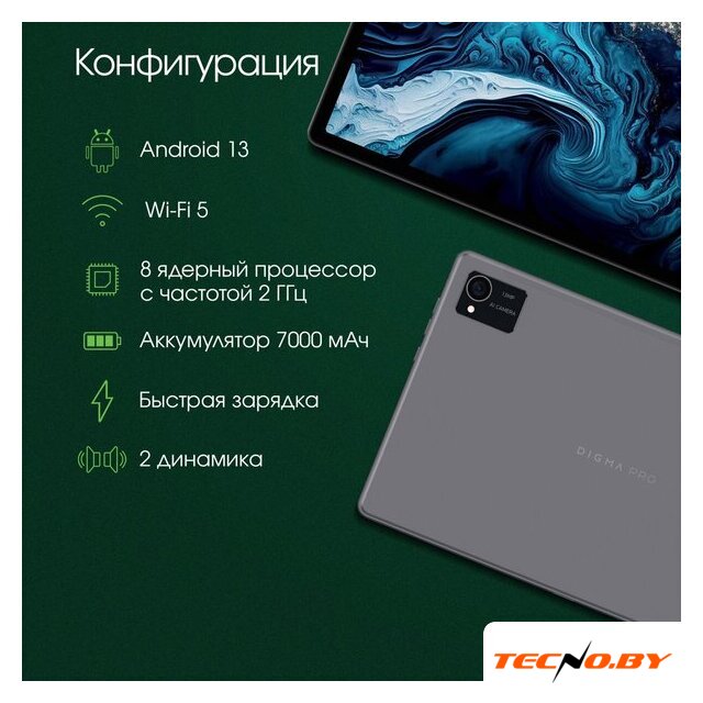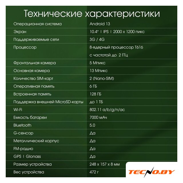 10.51" IPS, 60 Гц (1920x1200), Android, UniSoC Tiger T606, 8 ГБ / 256 ГБ, Wi-Fi + сотовая связь (nanoSIM + nanoSIM), аккумулятор 7000 мАч