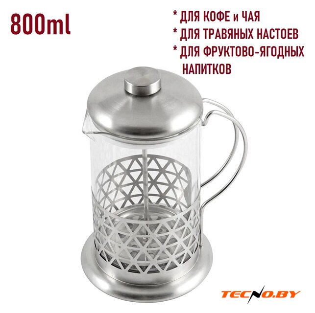 заварочный чайник, материал: никелированная сталь/стекло, 800 мл, цвет: нержавеющая сталь/прозрачный
