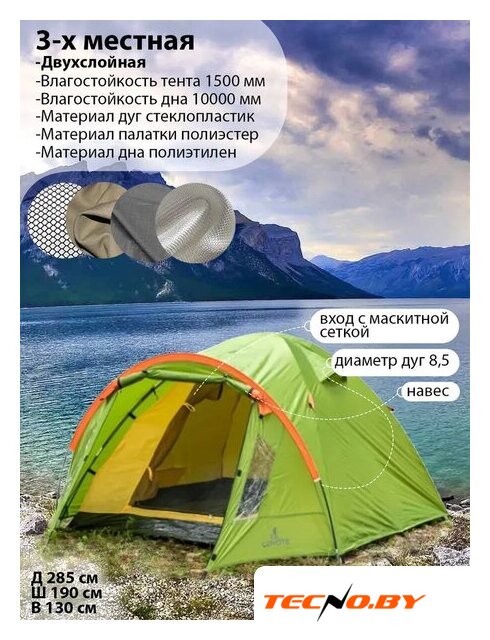 кемпинговая, весна/лето/осень, 3-местная, 1 вход, 1 комната, противомоскитная сетка, тамбур, штормовые оттяжки, ДхШхВ: 300x180x120 см