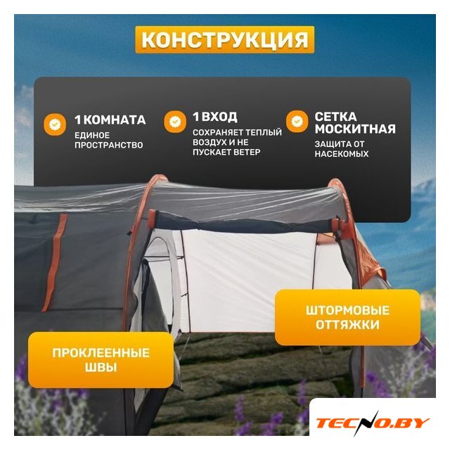 кемпинговая, весна/лето/осень, 3-местная, 1 вход, 1 комната, противомоскитная сетка, тамбур, штормовые оттяжки, ДхШхВ: 285x190x130 см