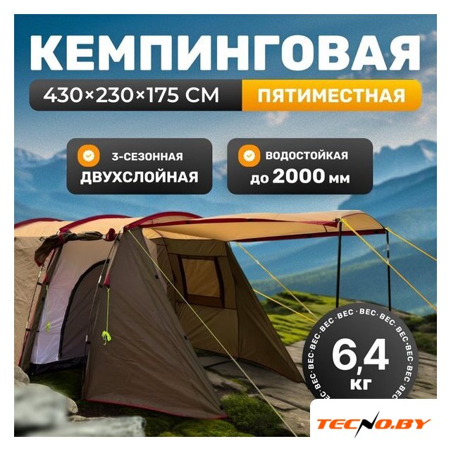 кемпинговая, весна/лето/осень, 5-местная, 1 вход, 1 комната, противомоскитная сетка, тамбур, штормовые оттяжки, ДхШхВ: 375x275x160 см