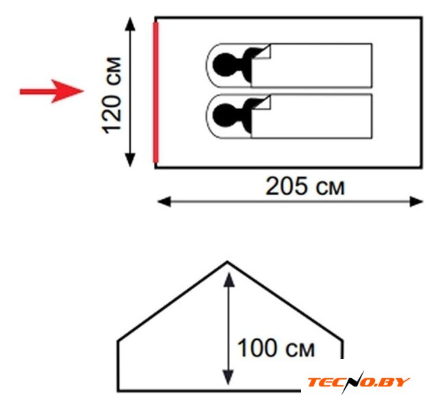 кемпинговая, весна/лето/осень, 2-местная, 1 вход, 1 комната, противомоскитная сетка, штормовые оттяжки, ДхШхВ: 205x120x105 см