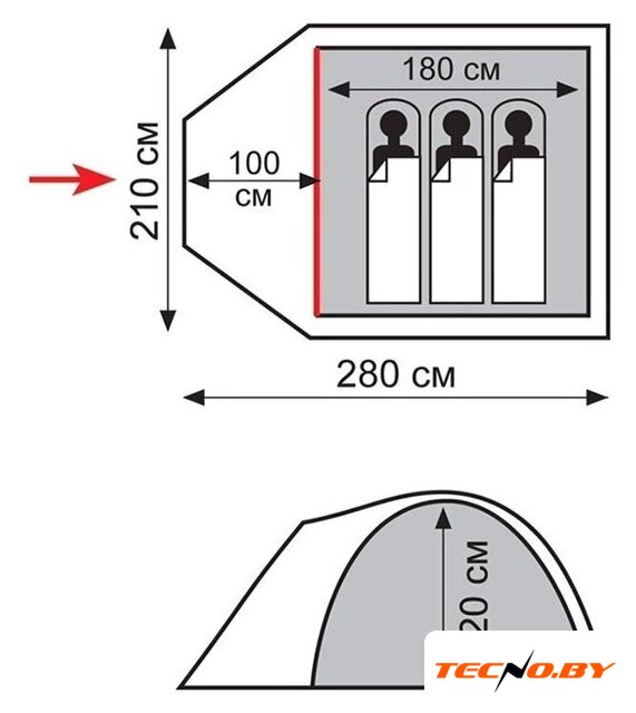 кемпинговая, весна/лето/осень, 3-местная, 1 вход, 1 комната, противомоскитная сетка, тамбур, штормовые оттяжки, ДхШхВ: 285x190x130 см