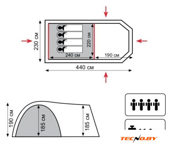 кемпинговая, зима/весна/лето/осень, 4-местная, 2 входа, 1 комната, противомоскитная сетка, тамбур, штормовые оттяжки, ДхШхВ: 365x260x205 см