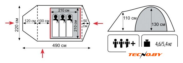 треккинговая, весна/лето/осень, 3-местная, 2 входа, 1 комната, противомоскитная сетка, тамбур, штормовые оттяжки, ДхШхВ: 370x210x130 см
