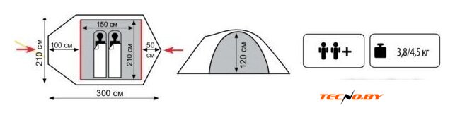 треккинговая, весна/лето/осень, 3-местная, 2 входа, 1 комната, противомоскитная сетка, тамбур, штормовые оттяжки, ДхШхВ: 490x220x130 см