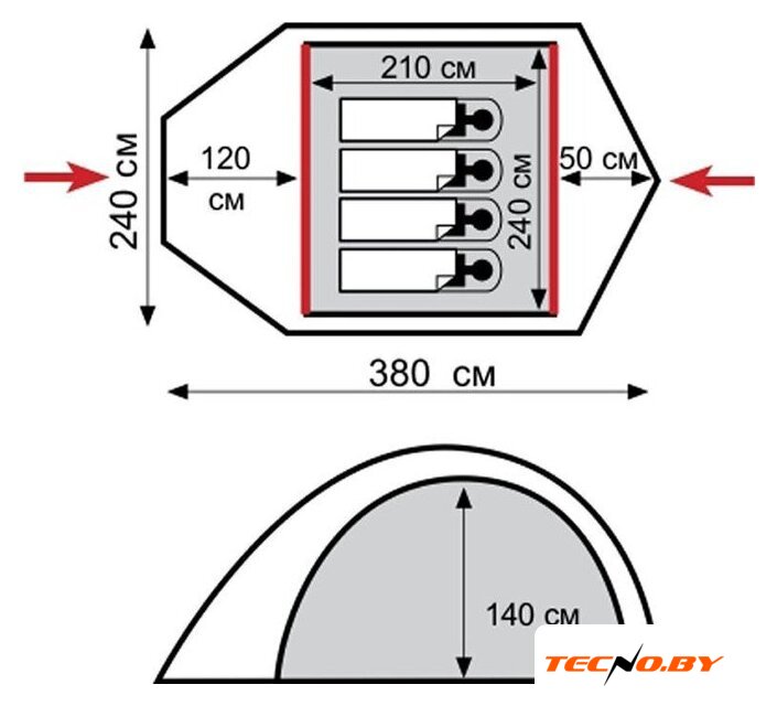 треккинговая, весна/лето/осень, 4-местная, 2 входа, 1 комната, противомоскитная сетка, тамбур, штормовые оттяжки, ДхШхВ: 375x255x140 см