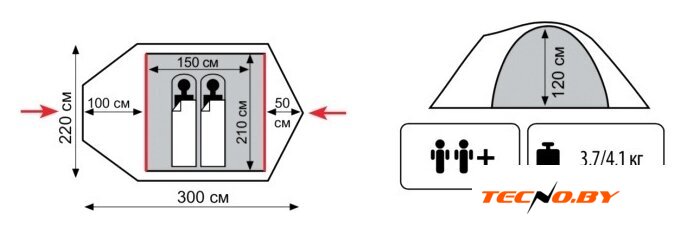 кемпинговая, весна/лето/осень, 3-местная, 2 входа, 1 комната, противомоскитная сетка, тамбур, штормовые оттяжки, ДхШхВ: 365x220x200 см