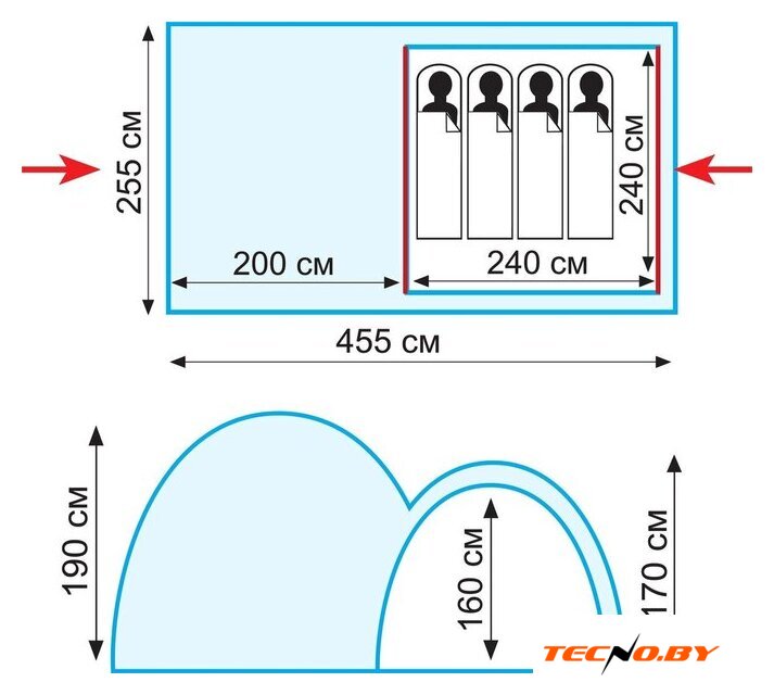 кемпинговая, зима/весна/лето/осень, 4-местная, 2 входа, 1 комната, противомоскитная сетка, тамбур, штормовые оттяжки, ДхШхВ: 365x260x205 см