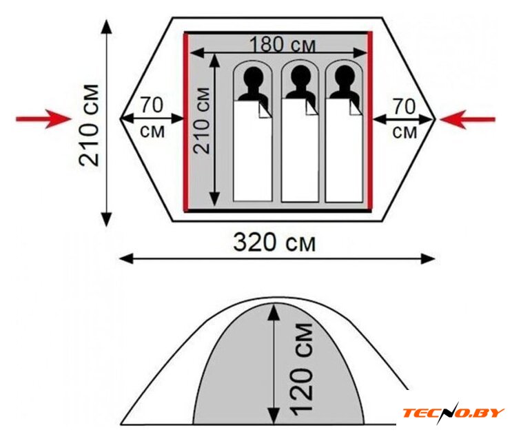 кемпинговая, весна/лето/осень, 3-местная, 2 входа, 1 комната, противомоскитная сетка, тамбур, штормовые оттяжки, ДхШхВ: 295x215x125 см