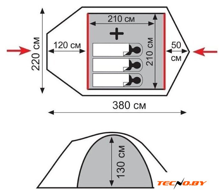 треккинговая, весна/лето/осень, 3-местная, 2 входа, 1 комната, противомоскитная сетка, тамбур, штормовые оттяжки, ДхШхВ: 320x220x120 см