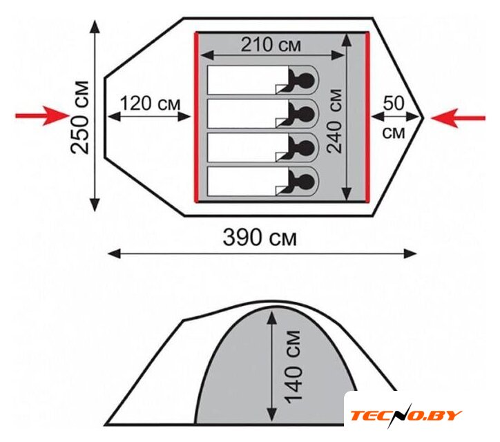 треккинговая, весна/лето/осень, 4-местная, 2 входа, 1 комната, противомоскитная сетка, тамбур, штормовые оттяжки, ДхШхВ: 390x250x140 см