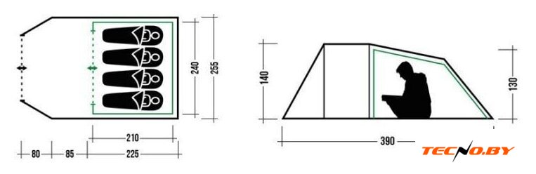 кемпинговая, весна/лето/осень, 4-местная, 2 входа, 1 комната, противомоскитная сетка, тамбур, штормовые оттяжки, ДхШхВ: 360x250x140 см