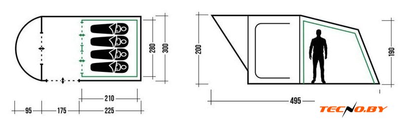 кемпинговая, весна/лето/осень, 3-местная, 2 входа, 1 комната, противомоскитная сетка, тамбур, штормовые оттяжки, ДхШхВ: 365x220x200 см