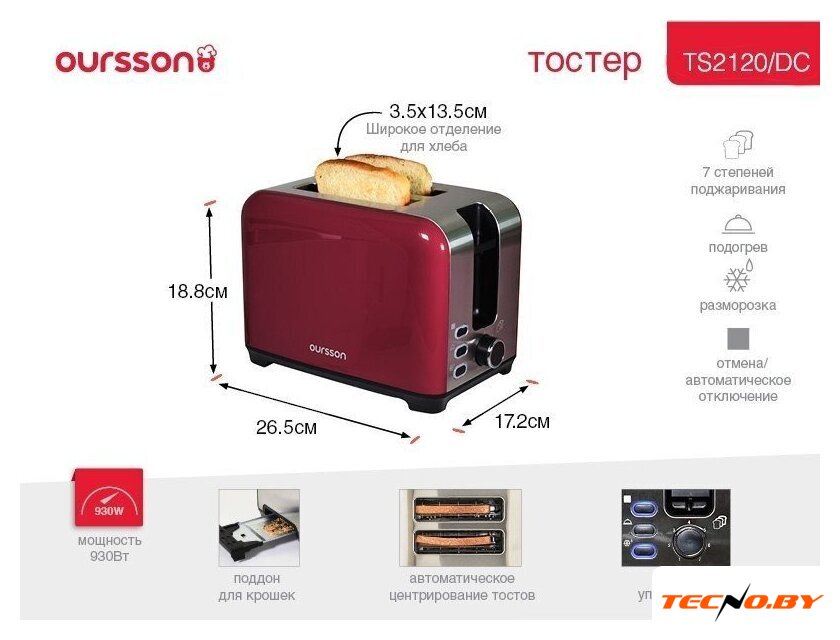 850 Вт, количество тостов: 2, корпус: металл, 7 степеней обжаривания, цвет красный
