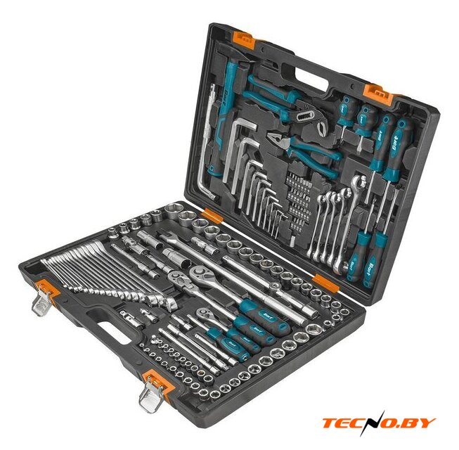 | Комплектация | Биты 25 мм (26 шт) Головки 1/4" (9 шт) Головки 1/2" Е-профиль (5 шт) Рукоятка с трещеткой квадрат 1/4 (1 шт) Рукоятка для головок (1 шт) Удлинитель 1/4":50 мм (1 шт) Удлинитель 1/4":100 мм (1 шт) Удлинитель 1/4":150мм (1 шт) Гибкий удлинитель (1 шт) Шарнир карданный 1/4 (1 шт) Головки 3/8" (15 шт) Рукоятка с трещеткой квадрат 3/8 (1 шт) Удлинитель 3/8 75 мм (1 шт) Удлинитель 3/8 250 мм (1 шт) Шарнир карданный 3/8” (1 шт) Головки 1/2" (19 шт) Головки 1/2" Е-профиль (5 шт) Головка торцевая свечная, 1/2" (2 шт) Шарнирный кардан 1/2" (1 шт) Вороток Г-образный 1/2" 250 мм (1 шт) Вороток шарнирный 1/2 430 мм (1 шт) Удлинитель 1/2":75 мм (1 шт) Удлинитель 1/2":150 мм (1 шт) Рукоятка с трещеткой квадрат 1/2 (1 шт) Переходник 3/8"–1/2" (1 шт) Переходник 3/8"–1/4" (1 шт) Держатель для бит (1 шт) Ключ имбусовый (10 шт) Ключ накидной (5 шт) Ключ комбинированный (17 шт) Отвертка (6 шт) Пассатижи (1 шт) Ключ трубный (1 шт) Молоток (1 шт) |