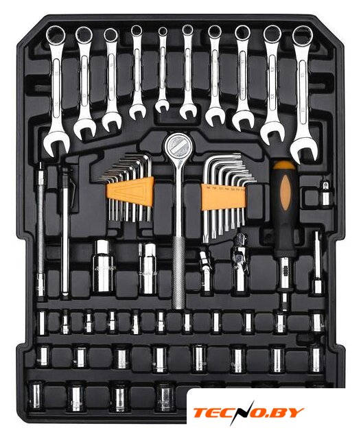 | Комплектация | - Комбинированные ключи 6, 7, 8, 9, 10, 11, 12, 13, 14, 15 мм.- Ключи шестигранные 1.5, 2, 2.5, 3, 3.5, 4, 5, 6 мм.- Разводной ключ 200 мм.- Уровень 250 мм.- Изоляционная лента 5м.- Ножницы 200 мм.- Инструмент для зачистки проводов 200 мм.- Строительный нож 18 мм.- Набор метизов по дереву 76 шт.- Рулетка 5м.- Кусачки 150 мм.- Отвертки с плоским шлицем (SL) 6х38, 4х75, 5х75, 6х100 мм.- Отвертки крестовые (PH) 2х38, 1х75, 2х100 мм.- Ключ Торкс (T) Т10, 15, 20, 25, 27, 30, 40.- Молоток 300 г.- Длинногубцы 150 мм.- Разводной ключ 45 градусов 225 мм.- Пассатижи с фиксатором, прямые губки 175 мм.- Пассатижи 150 мм.- Переходник для головок торцевых 6.35мм.- Струбцина быстрозажимная 100 мм 2 шт.- Отвертки точечные (SL 2.4, 3.0; PH 00, 0)- Головки 6.35 мм: 4, 4.5, 5, 5.5, 6, 7, 8, 9, 10, 11, 12, 13, 14 мм.- Головки 3/8": 6, 7, 8, 9, 10, 11, 12, 13, 14, 15, 16, 17 мм.- Головка 6.35 мм.- Головки свечные 10 мм.: 16, 21 мм.- Шарнир карданный 6.35: 10 мм.- Т-образная отвертка для бит 6.35 мм.- Удлинитель торцевых головок 10*75 мм.- Удлинитель гибкий 6.35*160 мм.- Поворотный адаптер для головок 6.35*10 мм.- Биты 25 мм. 20 шт.- Ключ Торкс Т40, Т50.- Кусачки 150 мм.- Трещотки- Манометр автомобильный- Отвертка для бит с трещоткой |