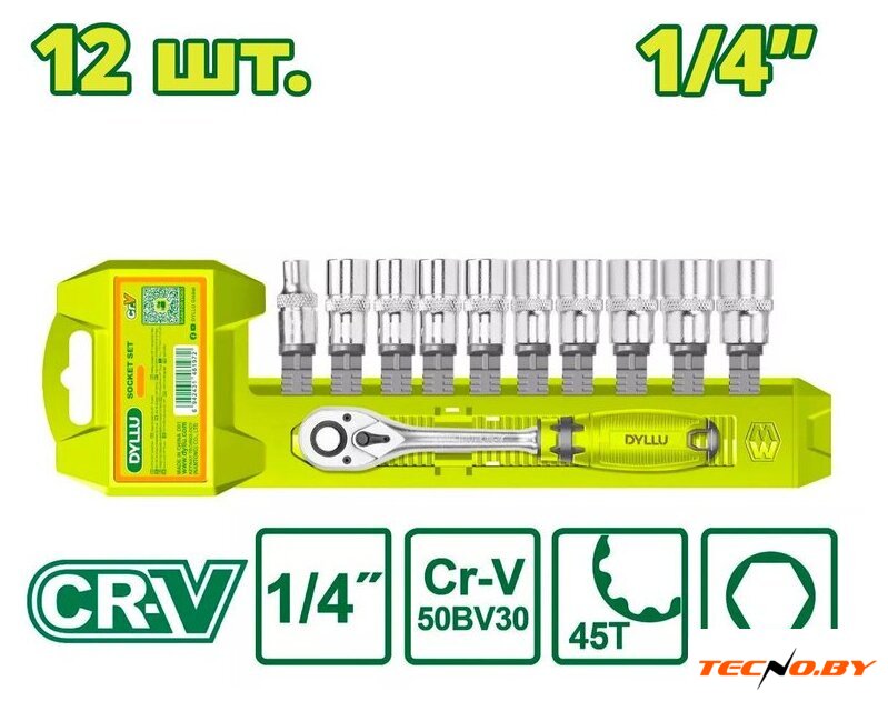 | Комплектация | Вороток с трещоткой 45T 1/4" - 1 шт. Торцевые головоки 1/4" (5, 6, 7, 8, 9, 10, 11, 12, 13, 14 мм) - 10 шт. Удлинитель 1/4" (75 мм) - 1 шт. Пластиковый подвес для хранения |