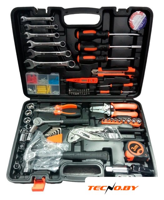 | Комплектация | Переставные клещи -1шт Длинногубцы 6" - 1штСтриппер для зачистки проводов -1штКомбинированный ключ -6 штНабор ключей шестигранников - 8штМолоток-1 штОтвертка 2штНабор отверток для точечных работ 2 штИндикаторная отвертка -пробник 1штИзолента 1штРулетка 3м-1штМонтажный нож-1штТорцевые головки 1/4-9штГоловка торцевая свечная 3/8 16мм-1штГоловка торцевая свечная 3/8 21мм-1штУдлинитель 3/8" 75мм-1штТрещотка 3/8"-1штТорцевые головки 3/8-10штОтвертка-битодержатель -1штНабор бит 25мм 9штБита - адаптер для торцевых головок 1штНабор бит 50мм 10штНабор крепежа 1штКейс 1шт |