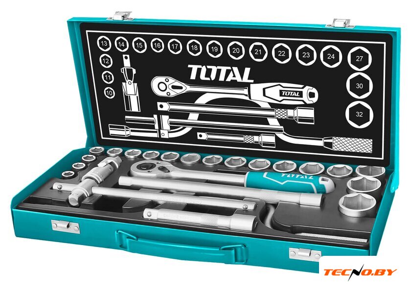 | Комплектация | Торцевые головки:10мм, 11мм, 12мм, 13мм, 14мм, 15мм, 16мм, 17мм, 18мм, 19мм, 20мм, 21мм, 22мм, 23мм, 24мм, 27мм, 30мм, 32мм - 18 шт.Ключ-трещотка - 1 шт.Вороток - 2 шт.Карданный шарнир - 1 шт.Жесткий удлинитель - 2 шт.Кейс металлический |