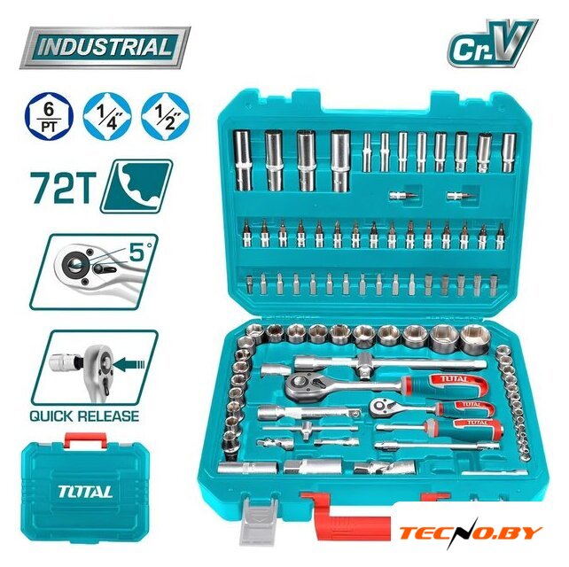 | Комплектация | Торцевые головки 1/2" (10 / 11 / 12 / 13 / 14 / 15 / 16 / 17 / 18 / 19 / 20 / 21 / 22 / 23 / 24 / 27 / 30 / 32 мм) - 18 шт. Торцевае головки 1/2", глубокая 77 мм (14 / 15 / 17 / 19 мм) - 4 шт. Торцевае головки 1/4" (4 / 4,5 / 5 / 5,5 / 6 / 7 / 8 / 9 / 10 / 11 / 12 / 13 / 14 мм) - 1 шт. Торцевае головки 1/4", глубокая 50 мм (6 / 7 / 8 / 9 / 10 / 11 / 12 / 13 мм) - 8 шт. Вороток с трещоткой 1/4", 72T - 1 шт. Вороток с трещоткой 1/2", 72T - 1 шт. Торцевае головки-биты 1/4"x32 мм (H3 / H4 / H5 / H6 / T8 / T10 / T15 / T20 / T25 / T30 / SL4 / SL5,5 / SL7 / PH1 / PH2 / PZ1 / PZ2) - 17 шт. Биты 5/16"x30 мм (H8 / H10 / H12 / H14 / SL8 / SL10 / SL12 / PZ3 / PZ4 / PH3 / PH4 / T40 / 45 / 50 / 55) - 15 шт. Свечные головки (16 и 21 мм) - 2 шт. Удлинитель 1/2" (125 и 250 мм) - 2 шт. Удлинитель 1/4" (50 и 100 мм) - 2 шт. Универсальный шарнир 1/2" - 1 шт. Универсальный шарнир 1/4" - 1 шт. Скользящая Т-образная планка 1/4", 114 мм - 1 шт. Скользящая Т-образная планка 1/2", 150 мм - 1 шт. Гибкий удлинитель 1/4", 150 мм - 1 шт. Адаптер для бит 1/4", 1/4"*25 мм - 1 шт. Трехходовой адаптер F3/8"xM1/2" - 1 шт. Переходник 1/2", 1/2"x5/16" - 1 шт. Шестигранные ключи (1,5 / 2 / 2,5 мм) - 3 шт. Кейс |