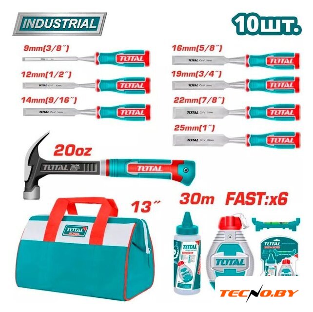 | Комплектация | - Молоток-гвоздодер THCH61020L - 1 шт.- Набор THT666301 (шнур разметочный 30м, мел 113г, уровень) - 1 шт.- Стамески THT4196, THT41126, THT41146, THT41166, THT41196, THT41226, THT41256 (9, 12, 14, 16, 19, 22, 25 мм) - 7 шт.- Сумка для инструментов THT261325 - 1 шт. |